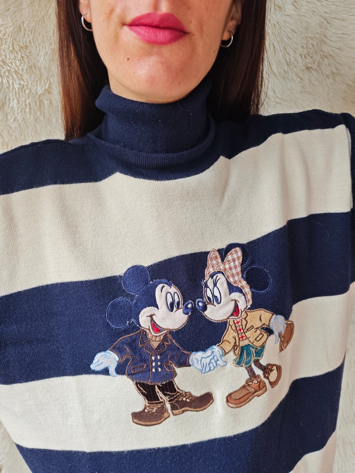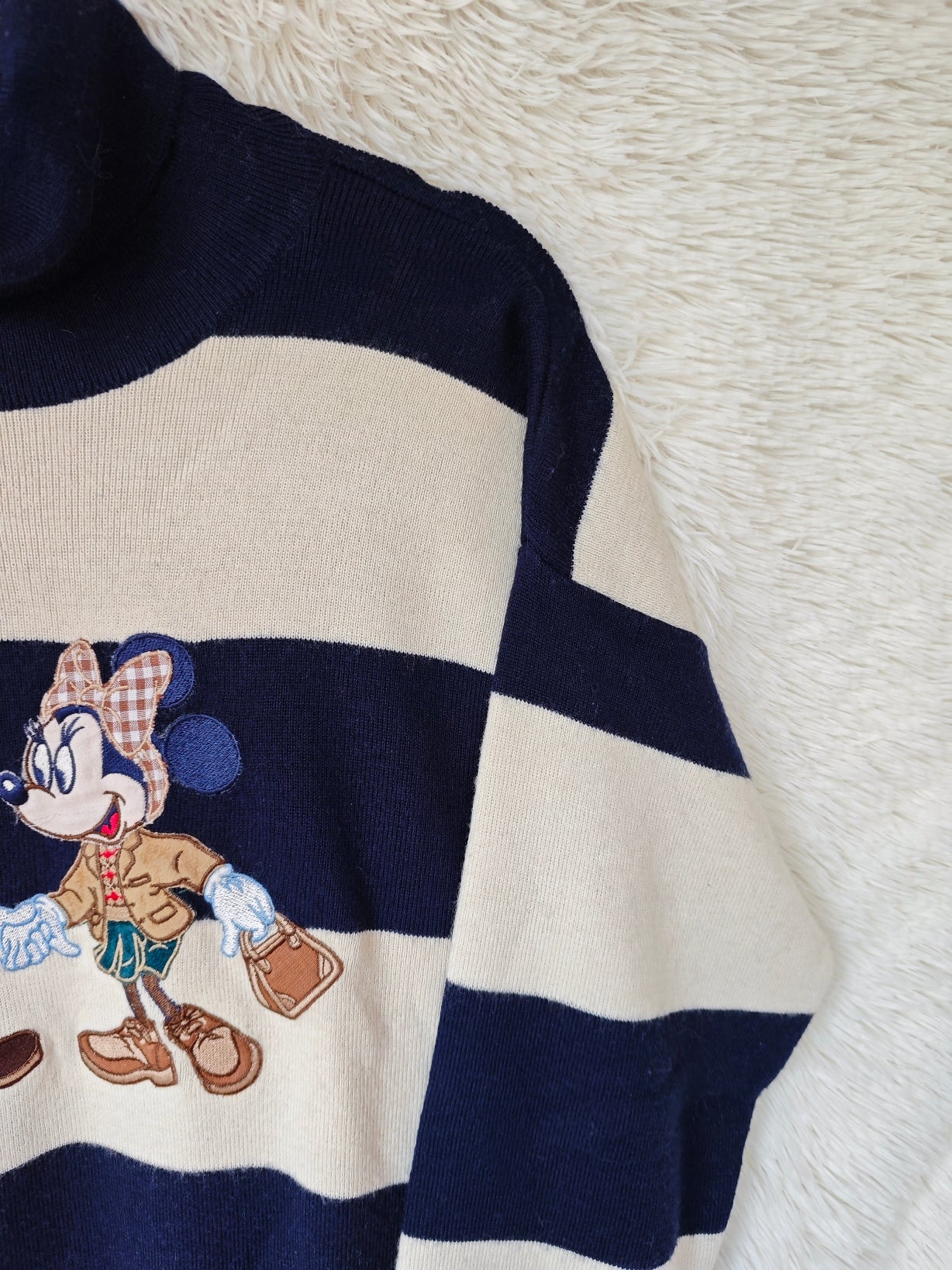 Ampie righe orizzontali nei toni del blu navy e dell’avorio, abbinate a un ricamo centrale ricco di dettagli con topolino e topolina.
