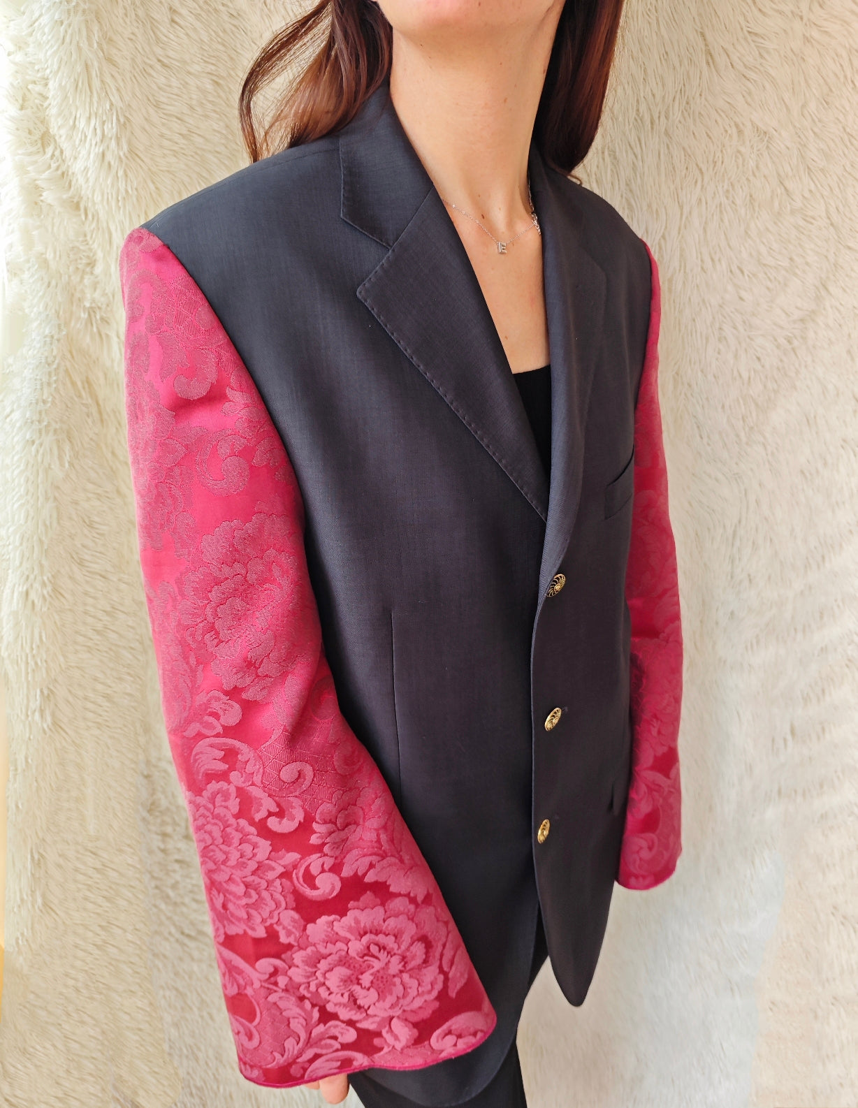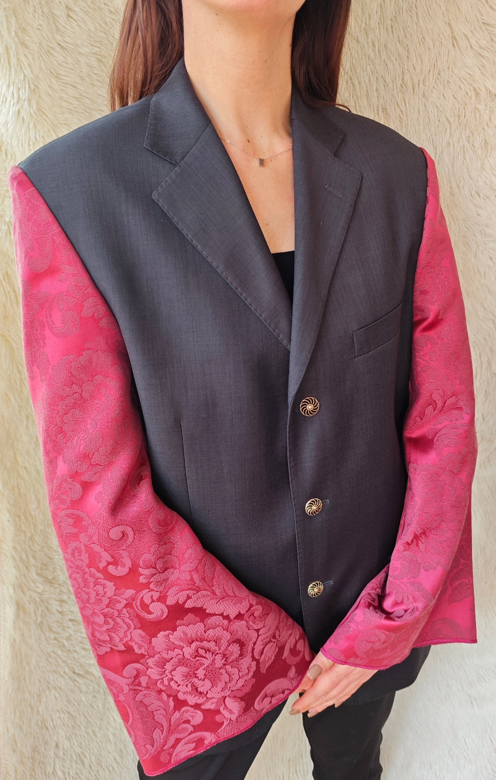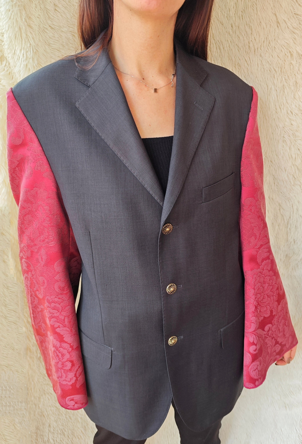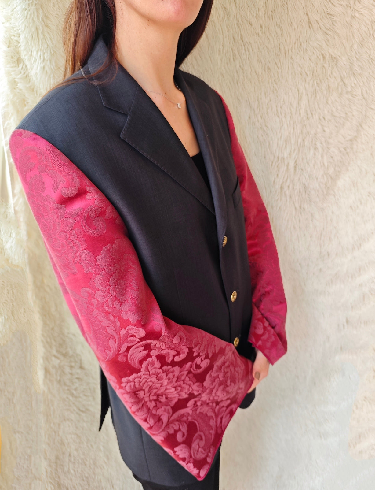 linea classica e strutturata, bottoni dorati gioiello e maniche voluminose in tessuto damascato bordeaux con motivo floreale ton sur ton.