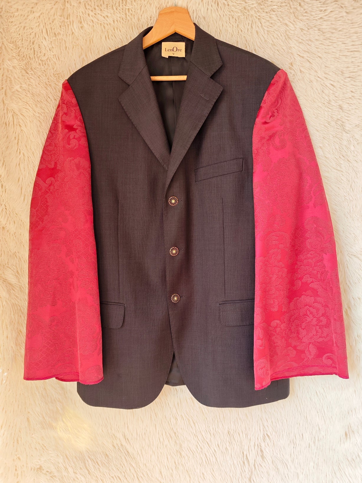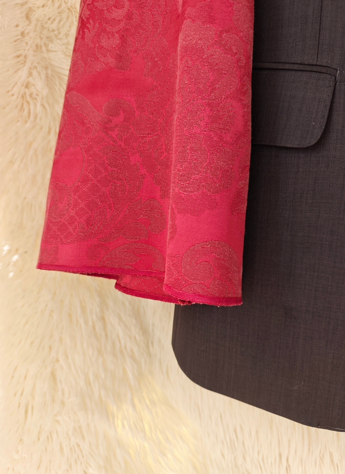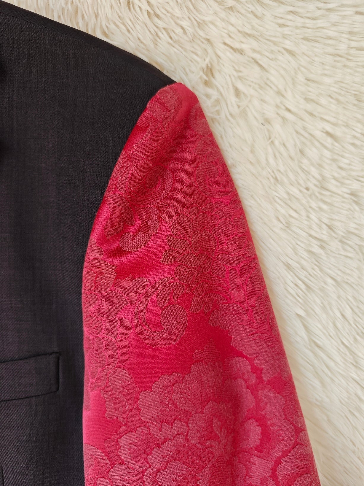 linea classica e strutturata, bottoni dorati gioiello e maniche voluminose in tessuto damascato bordeaux con motivo floreale ton sur ton.