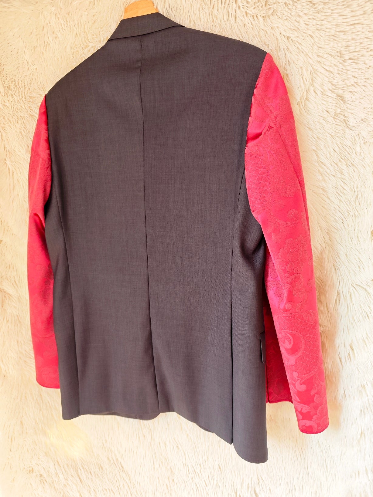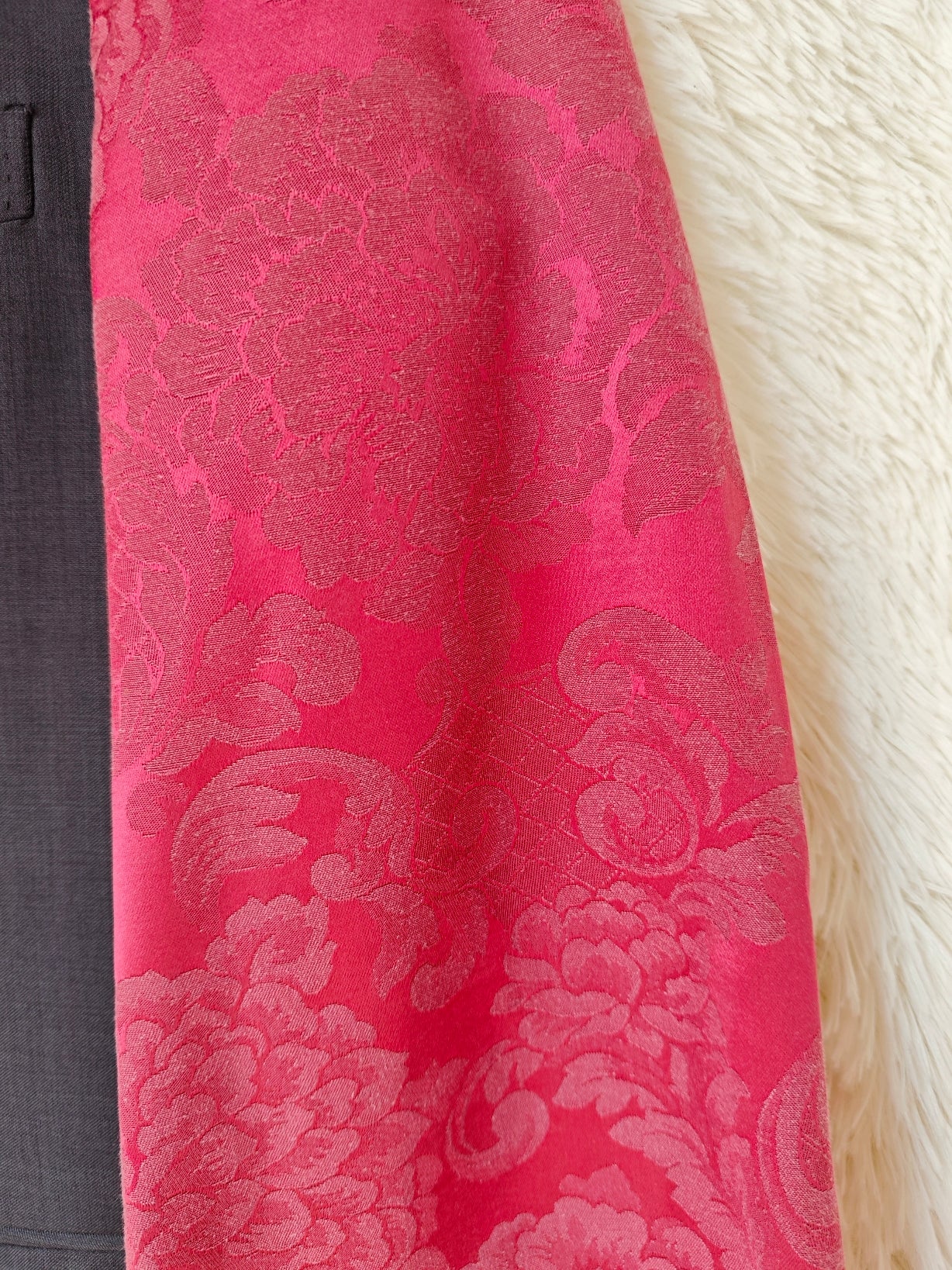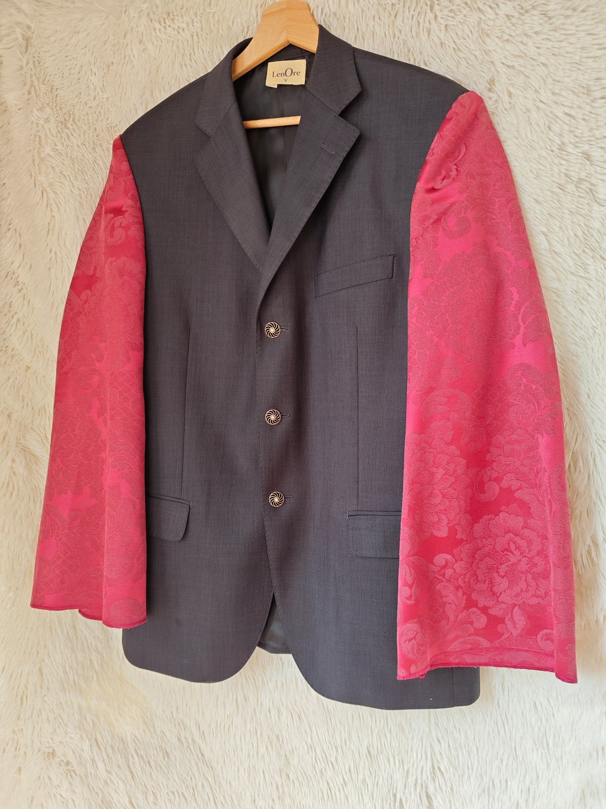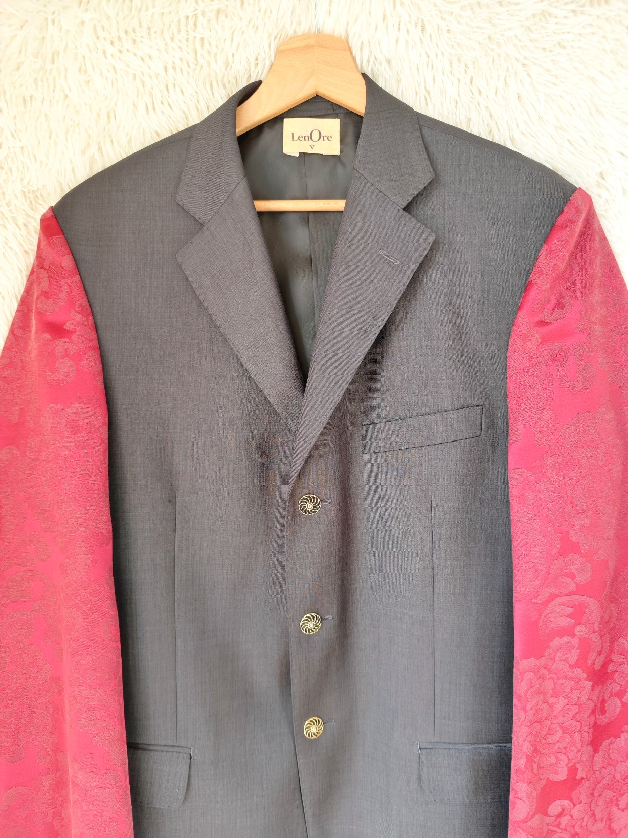 linea classica e strutturata, bottoni dorati gioiello e maniche voluminose in tessuto damascato bordeaux con motivo floreale ton sur ton.