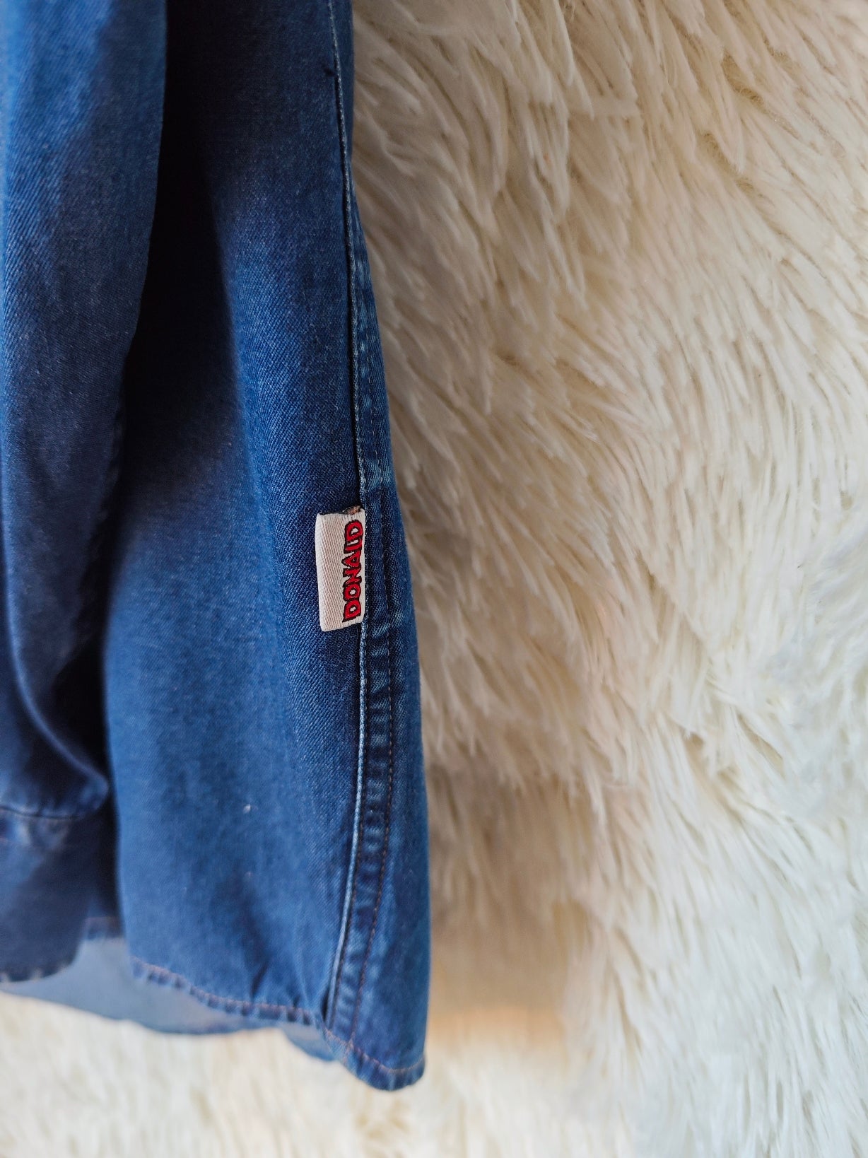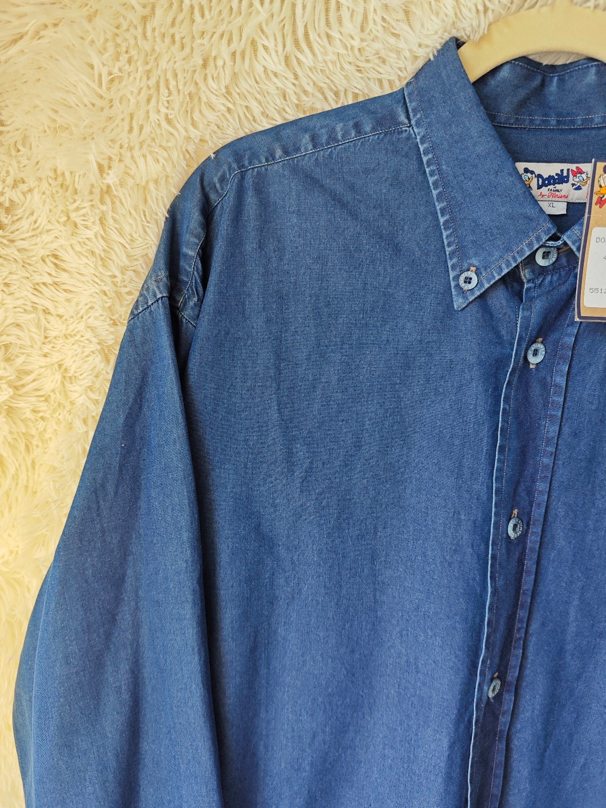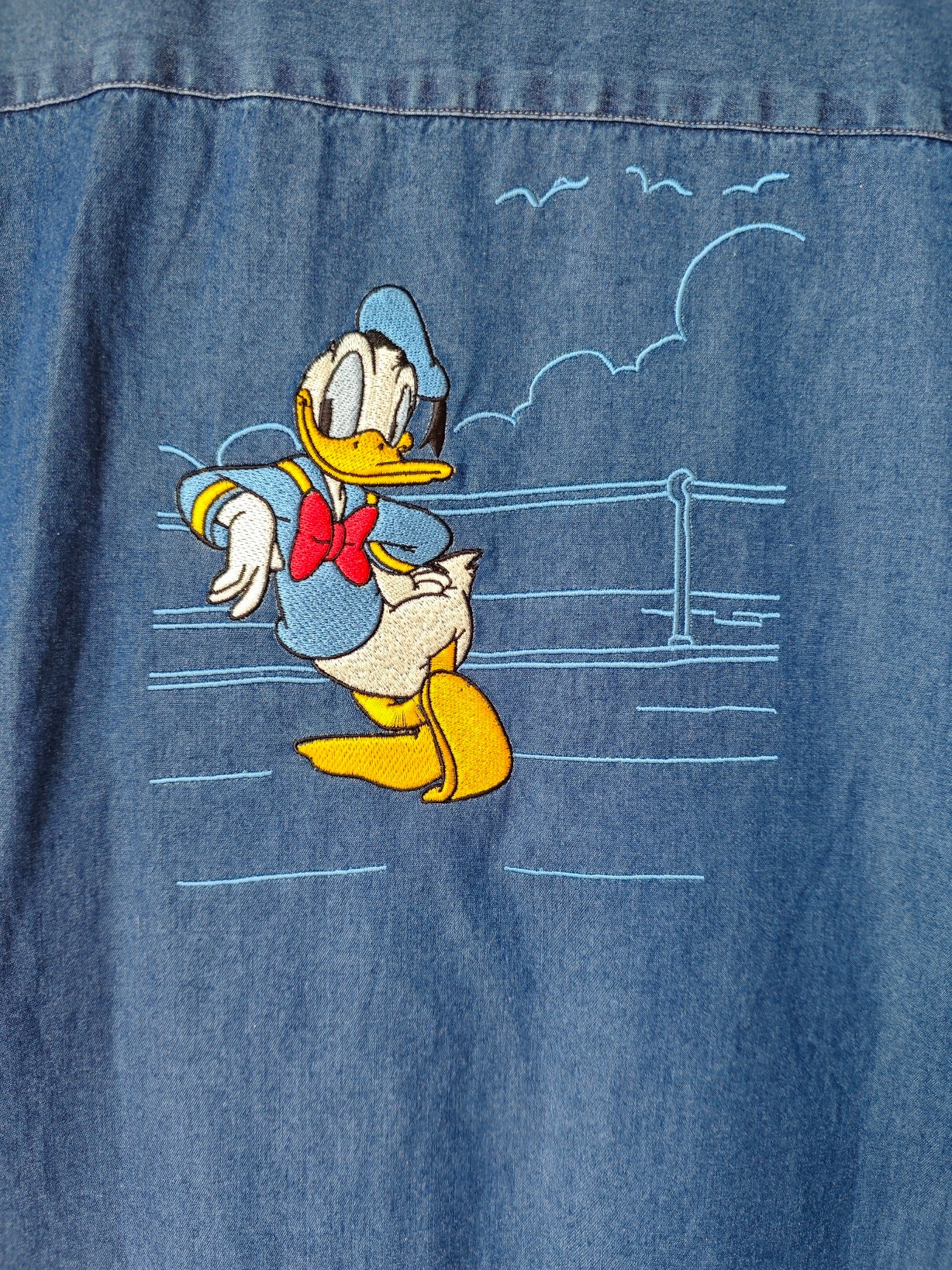 Sul davanti piccolo ricamo di paperino dietro grande ricamo di paperino.