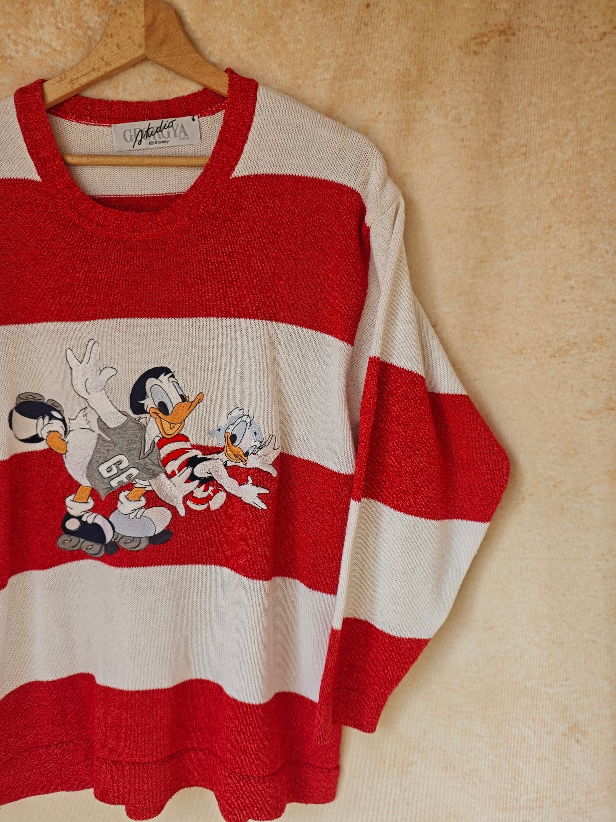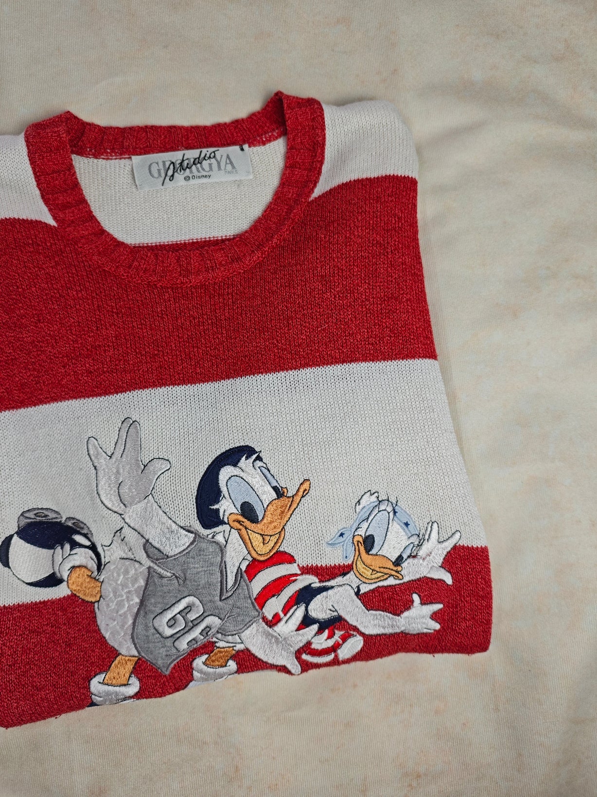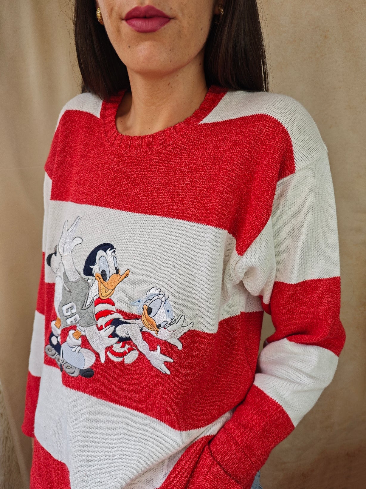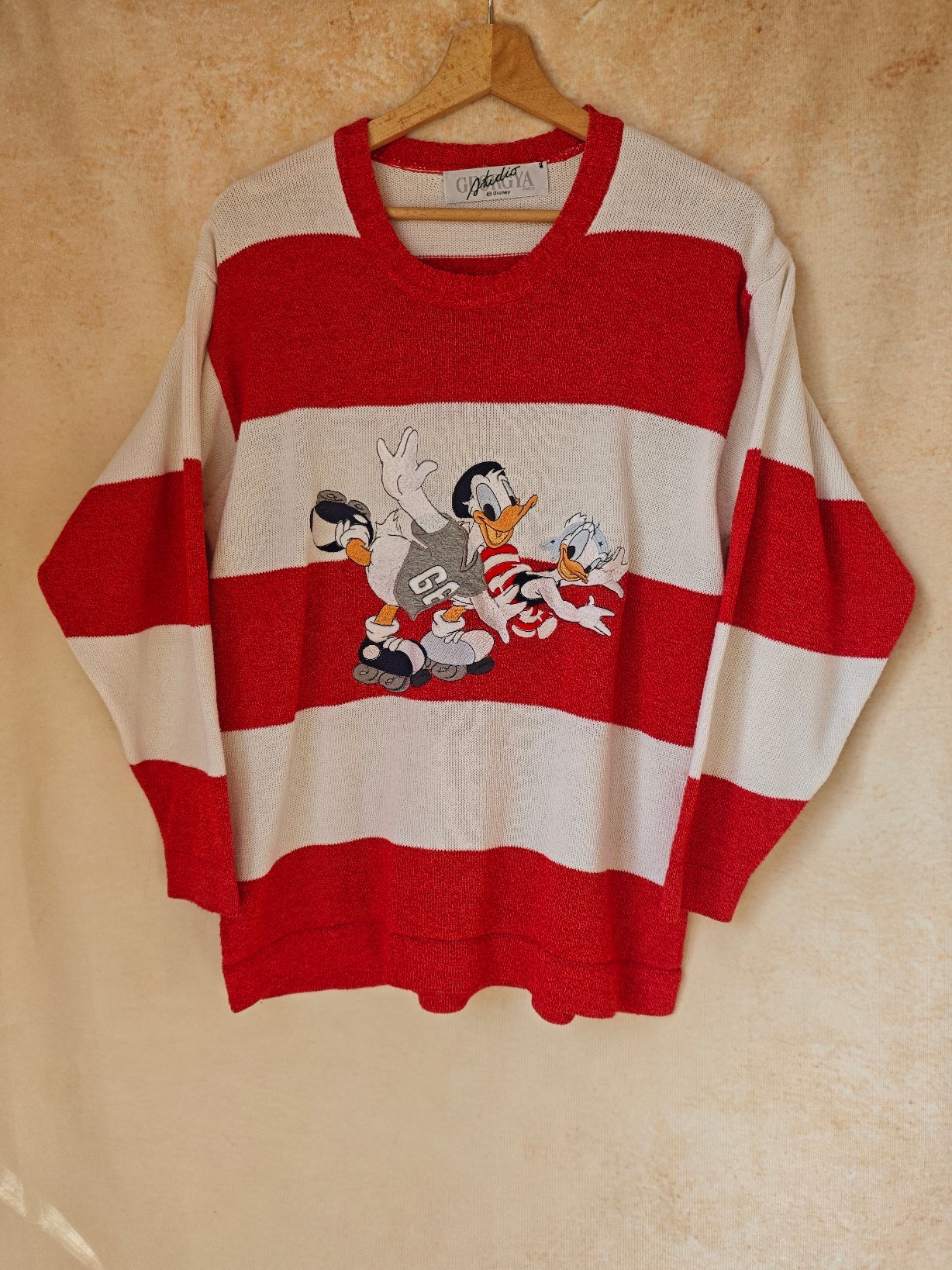 Maglione firmato Georgya Studio in misto cotone e acrilico, a maxi righe rosse e bianche. Sul davanti presenta un ricamo Disney con Paperino e Paperina che pattinano.