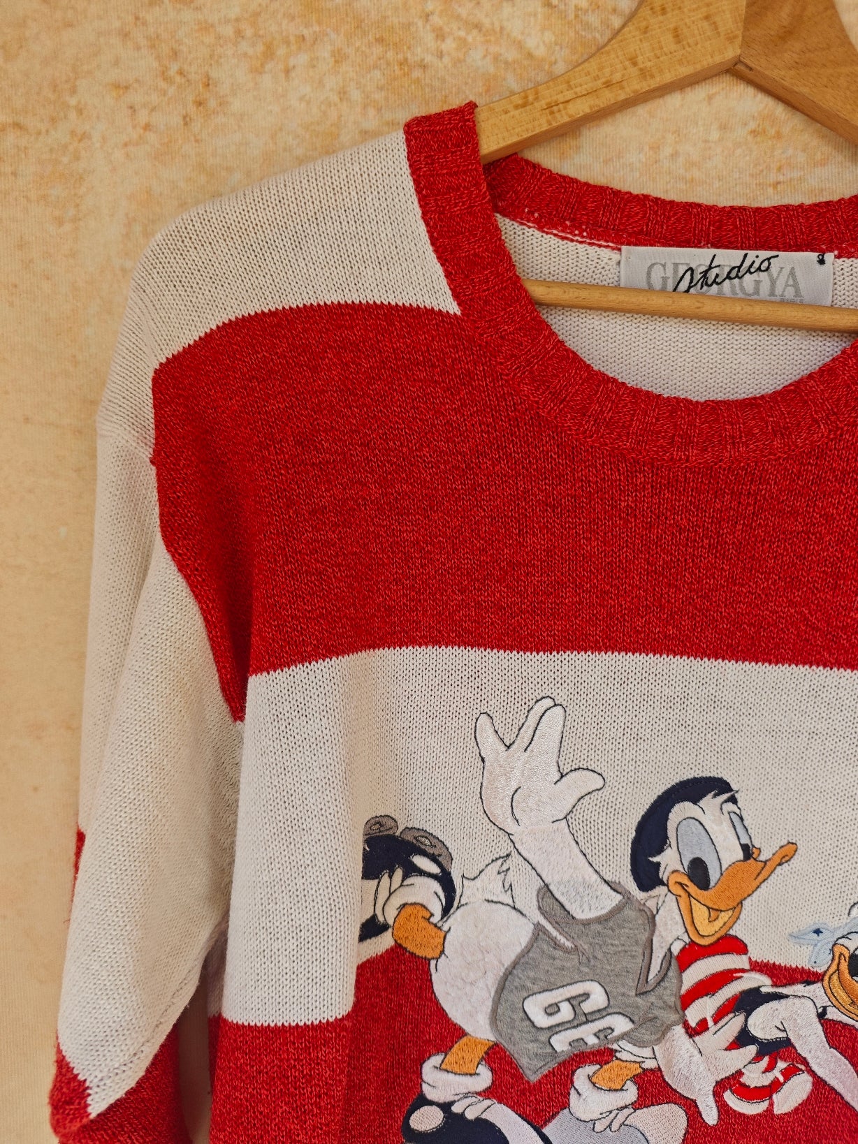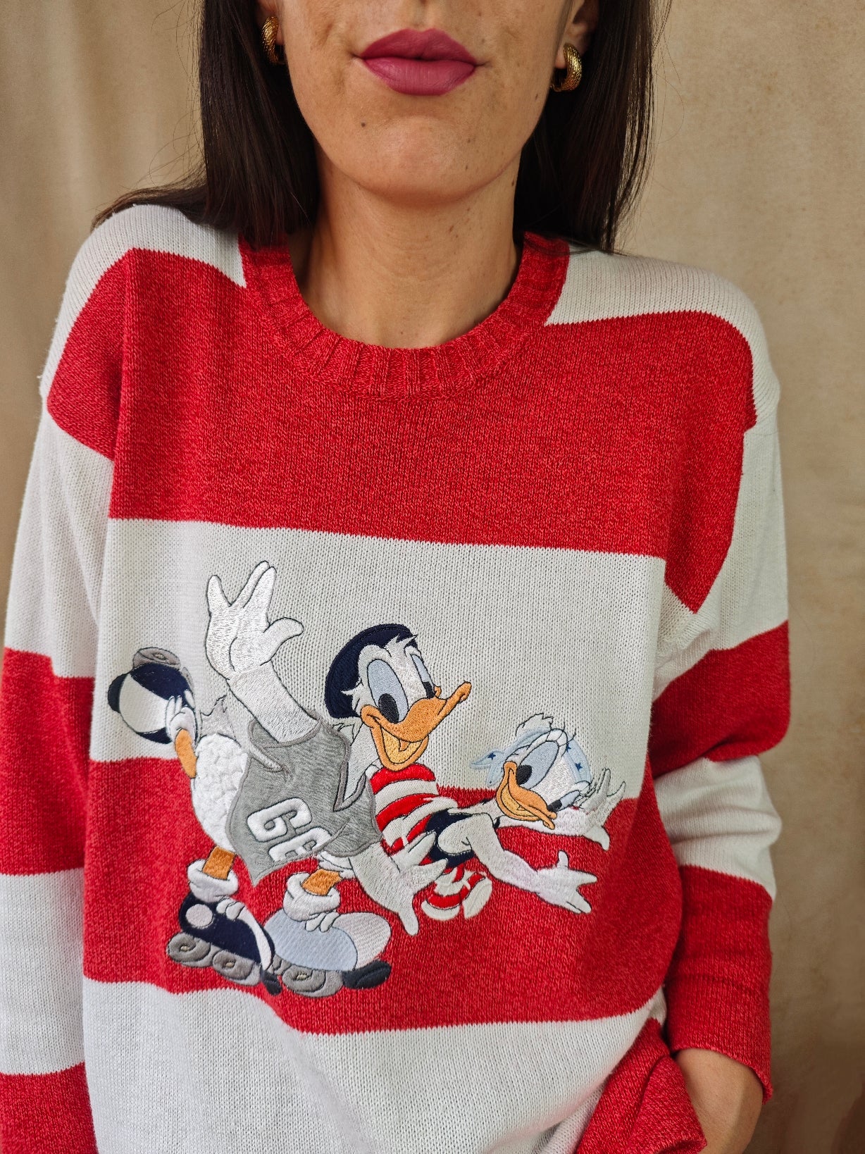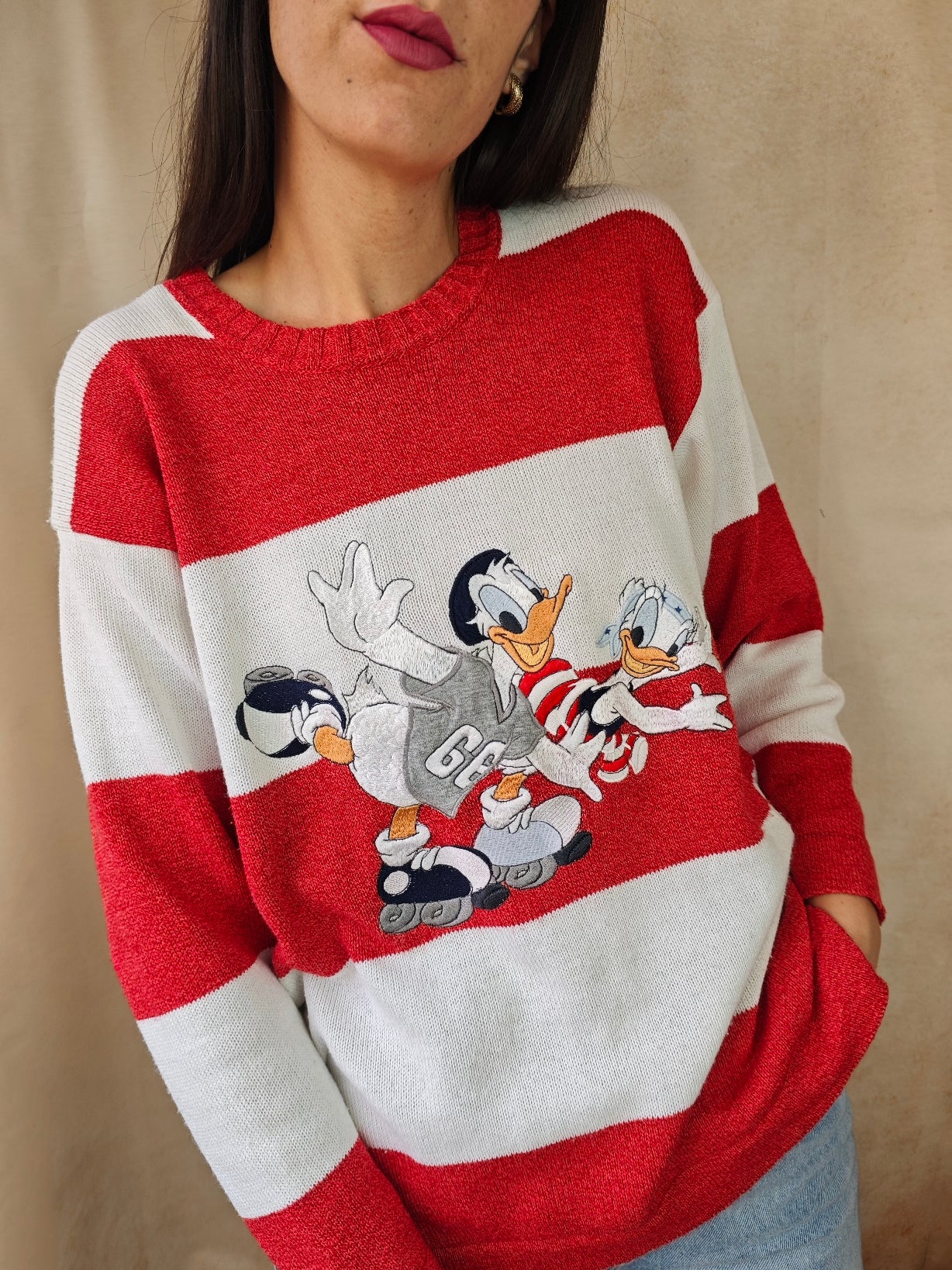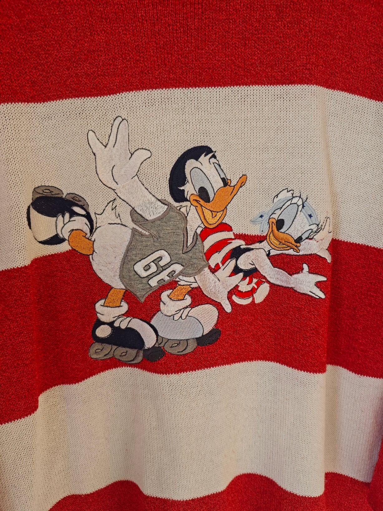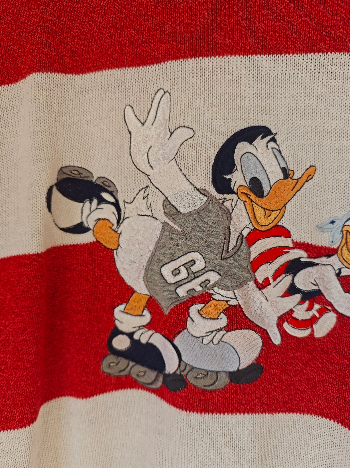 Maglione firmato Georgya Studio in misto cotone e acrilico, a maxi righe rosse e bianche. Sul davanti presenta un ricamo Disney con Paperino e Paperina che pattinano.