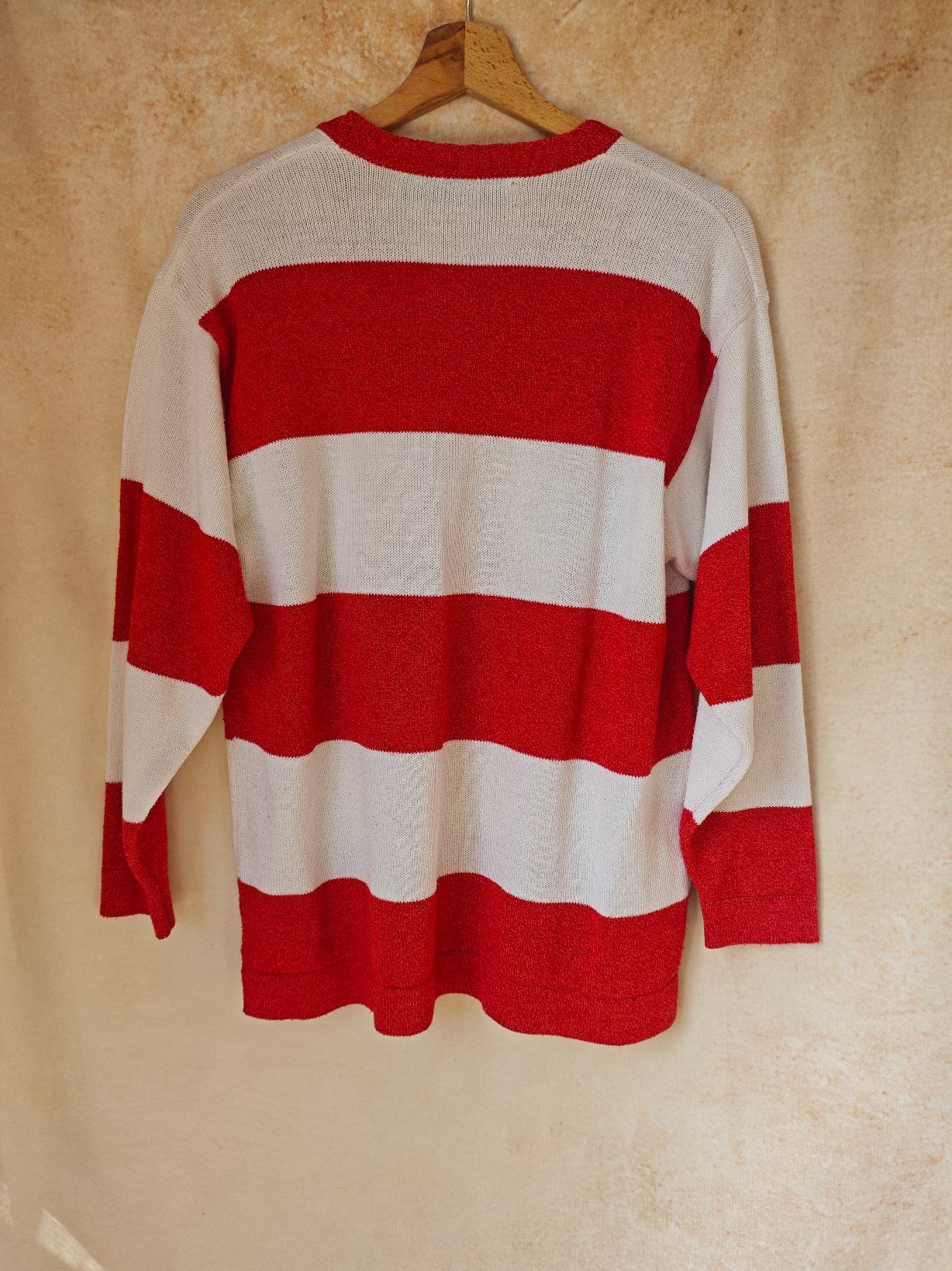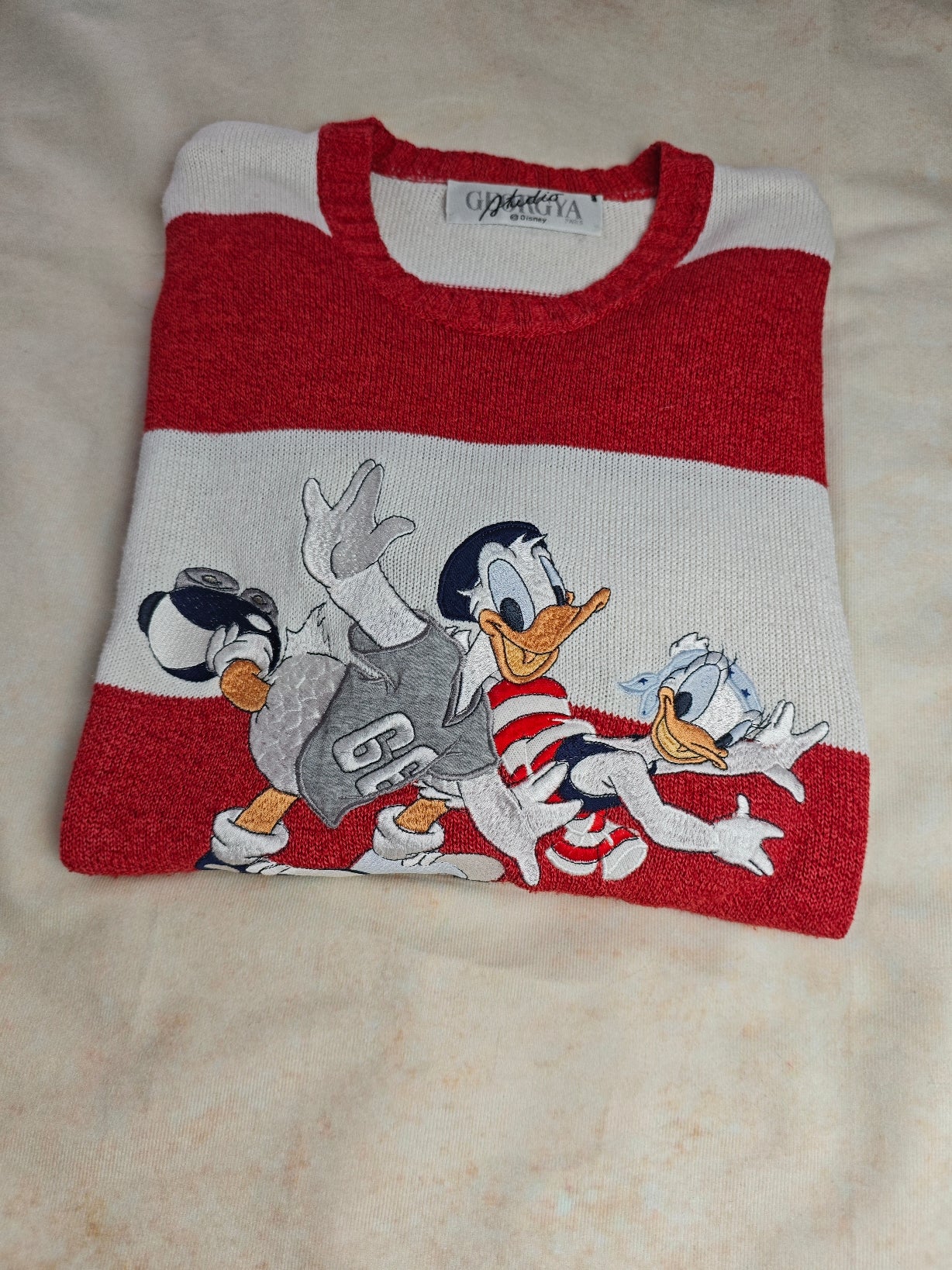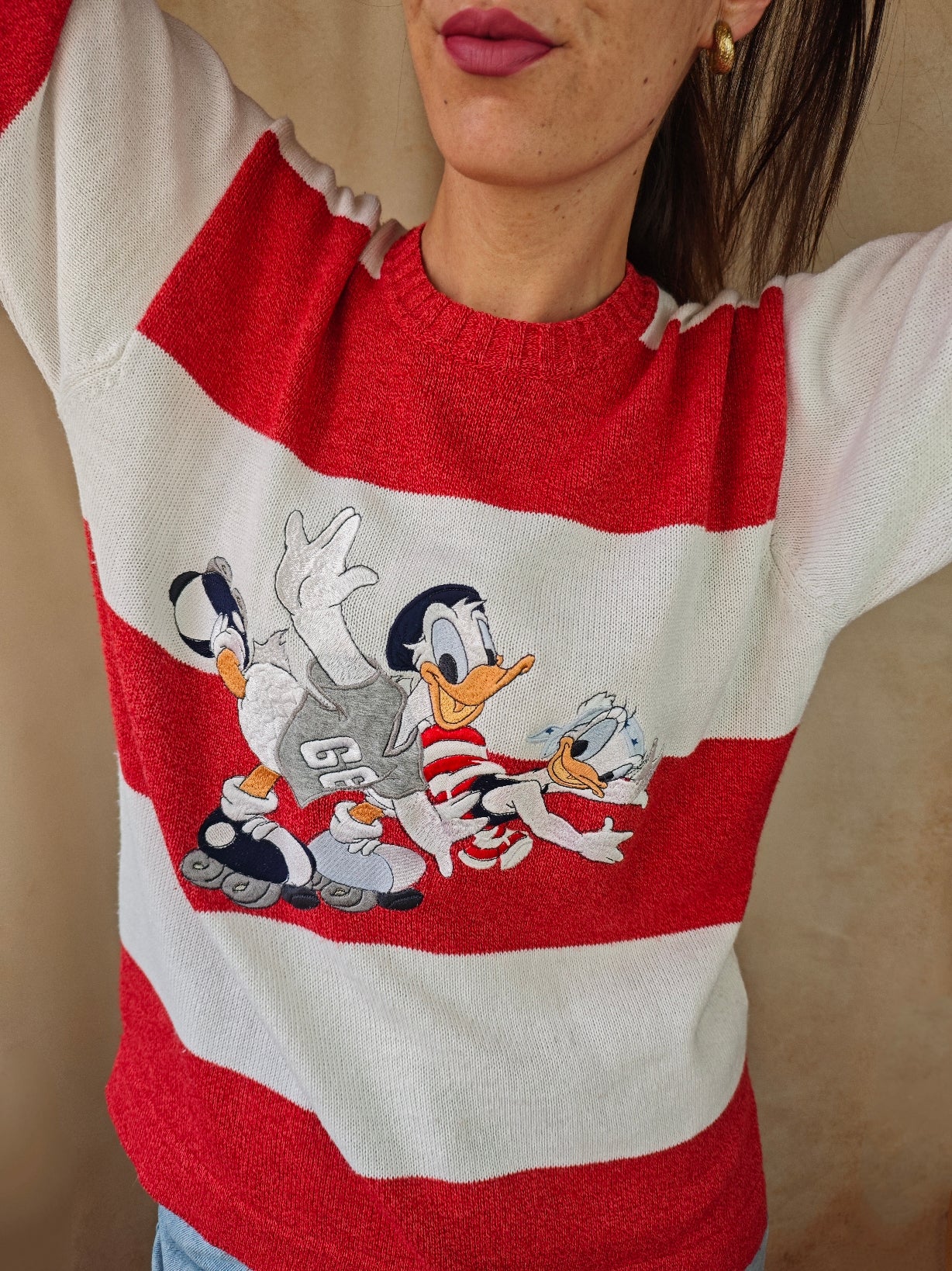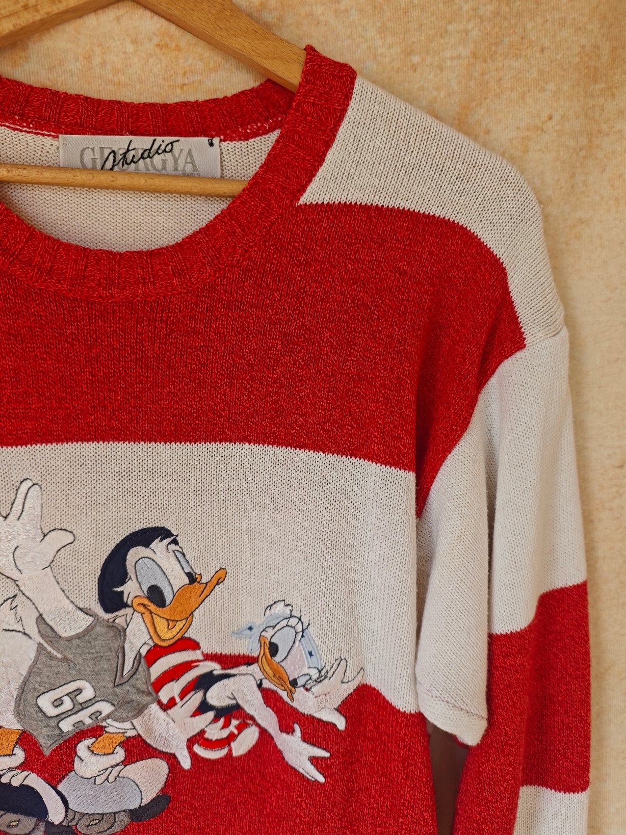 Maglione firmato Georgya Studio in misto cotone e acrilico, a maxi righe rosse e bianche. Sul davanti presenta un ricamo Disney con Paperino e Paperina che pattinano.