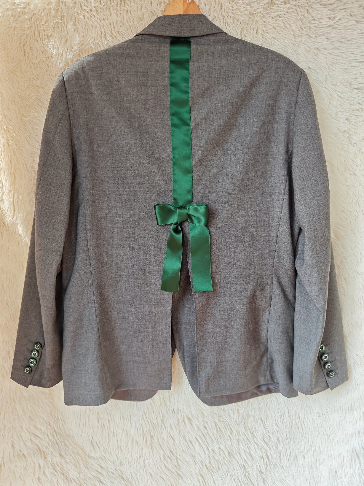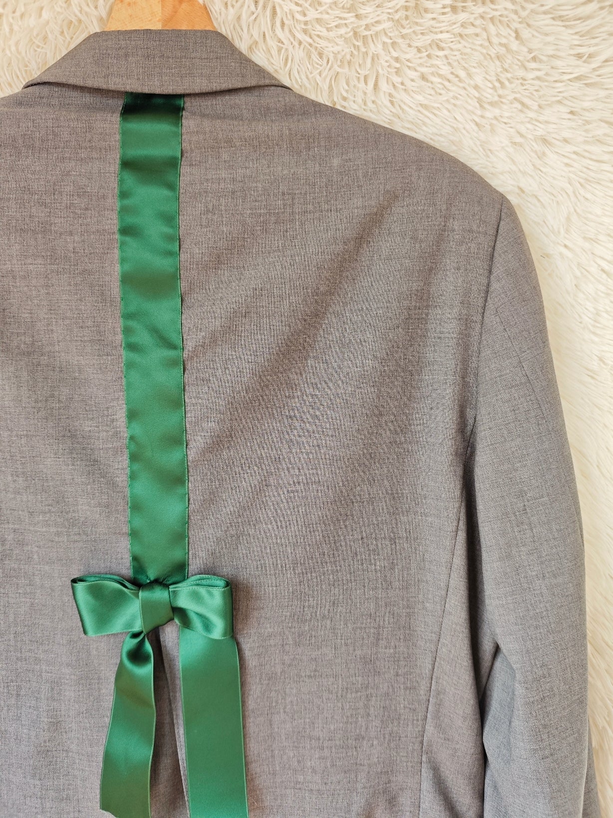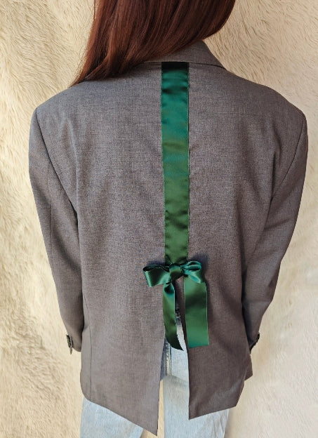 Spalla definita, chiusura frontale a tre bottoni verde smeraldo e bottoni coordinati sui polsini. Sul retro è stato applicato un nastro in raso verde smeraldo che termina con un fiocco, dettaglio che rende il capo unico mantenendo l’equilibrio del design.
