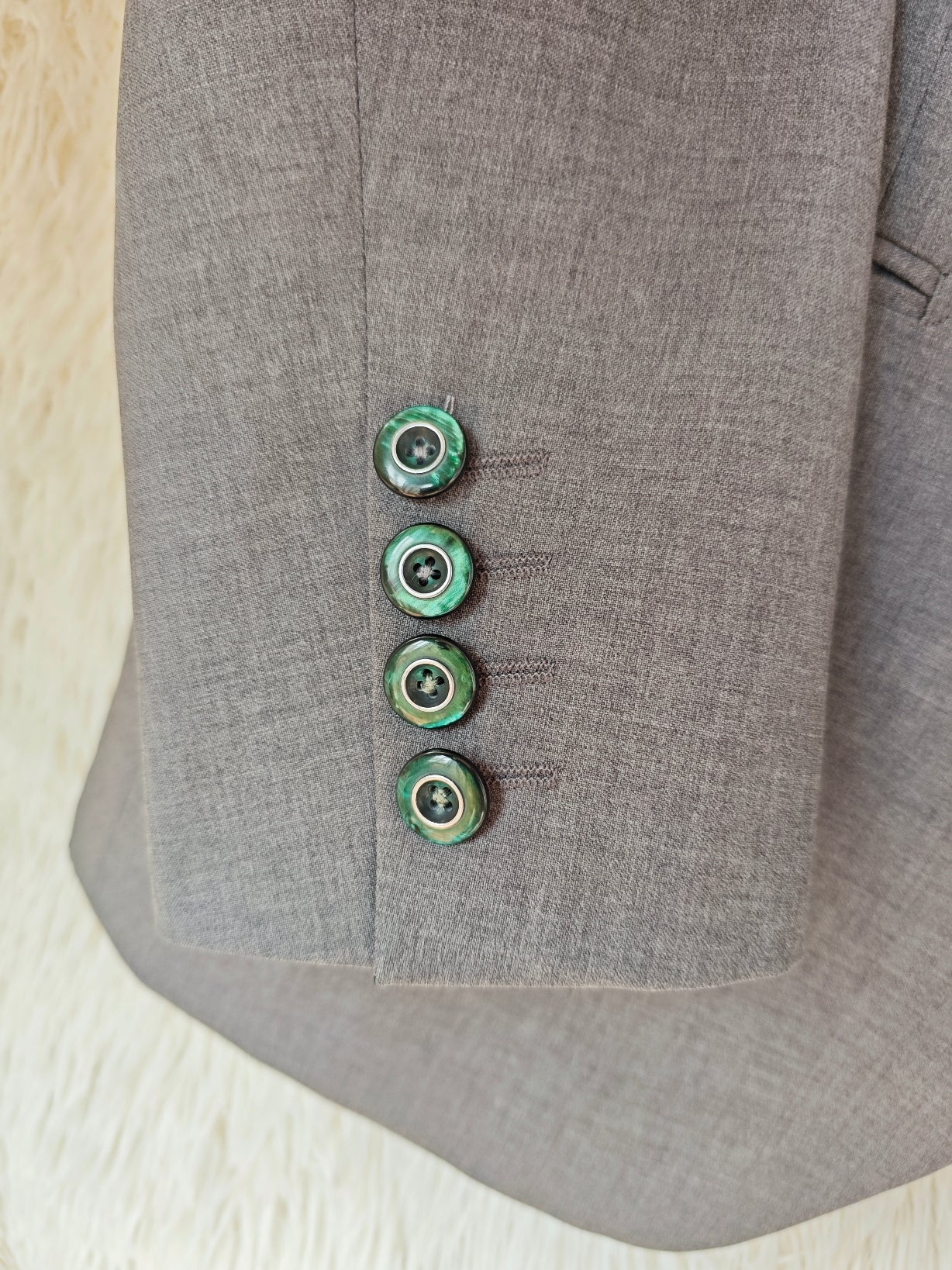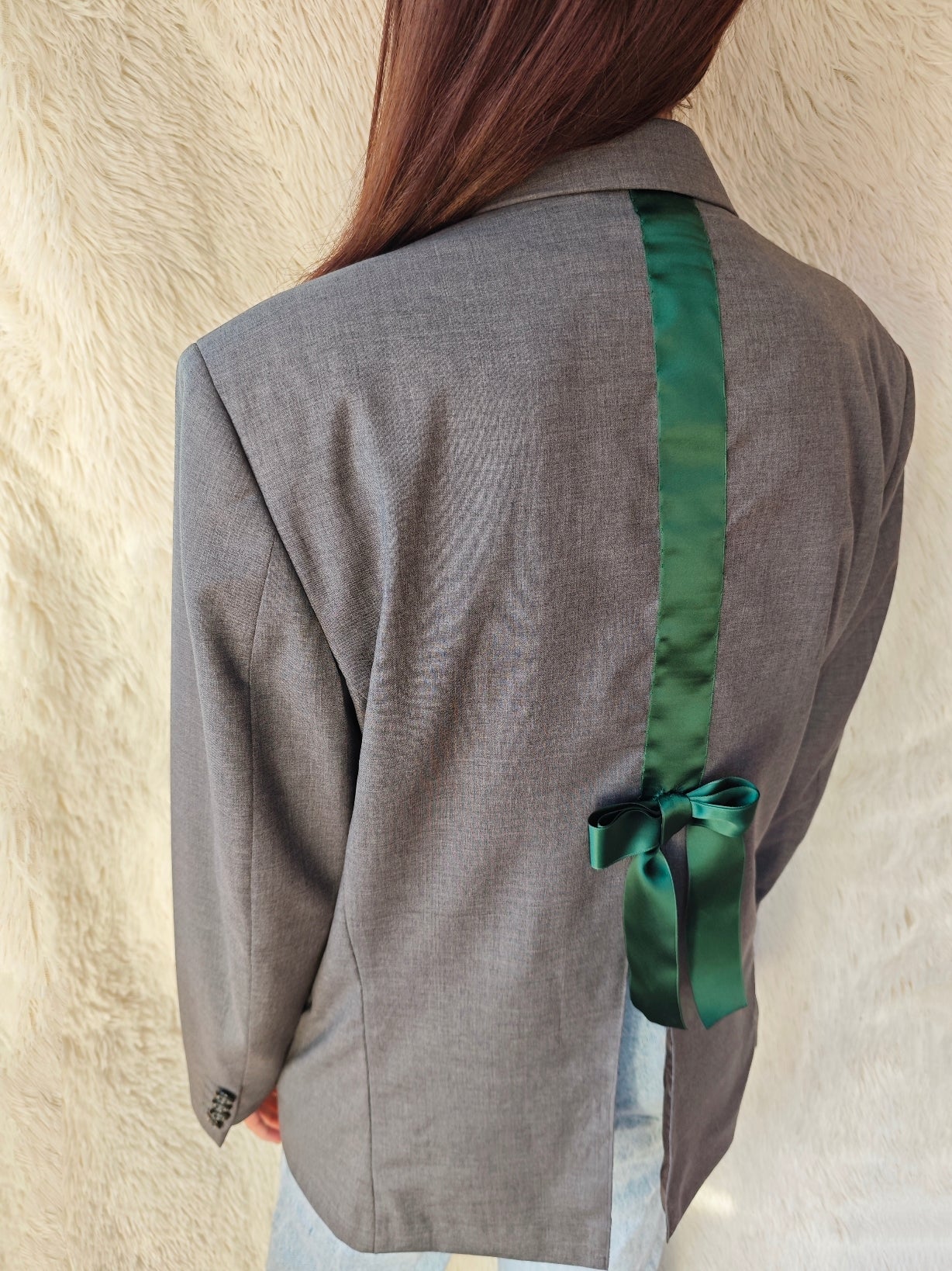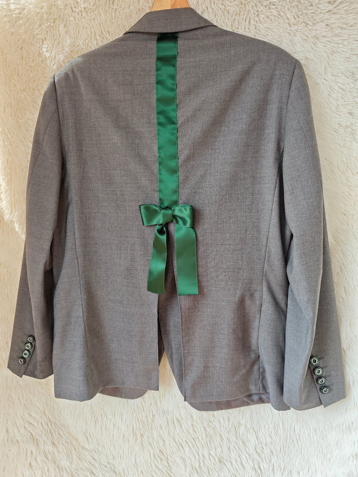 Spalla definita, chiusura frontale a tre bottoni verde smeraldo e bottoni coordinati sui polsini. Sul retro è stato applicato un nastro in raso verde smeraldo che termina con un fiocco, dettaglio che rende il capo unico mantenendo l’equilibrio del design.