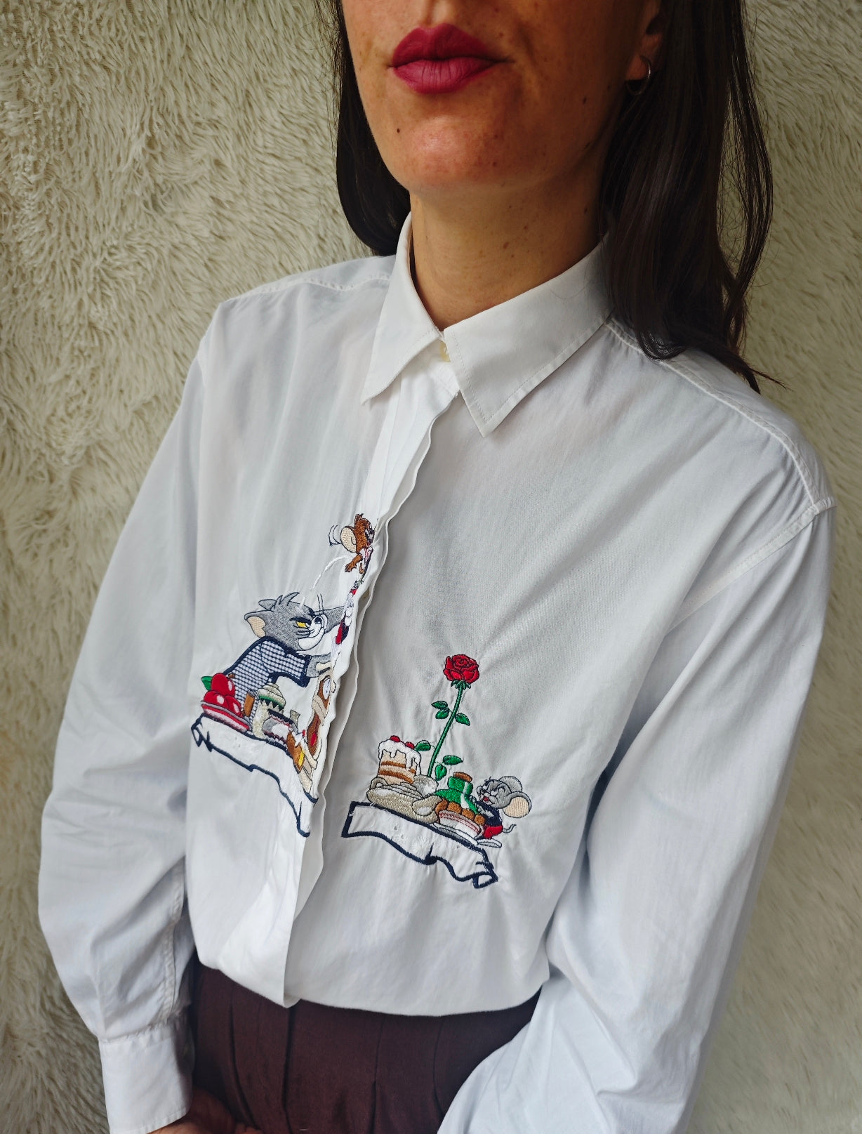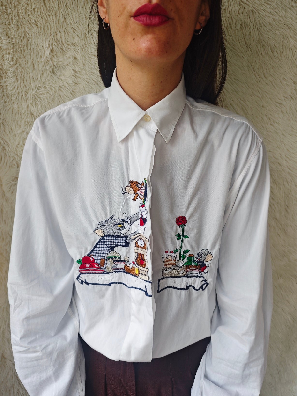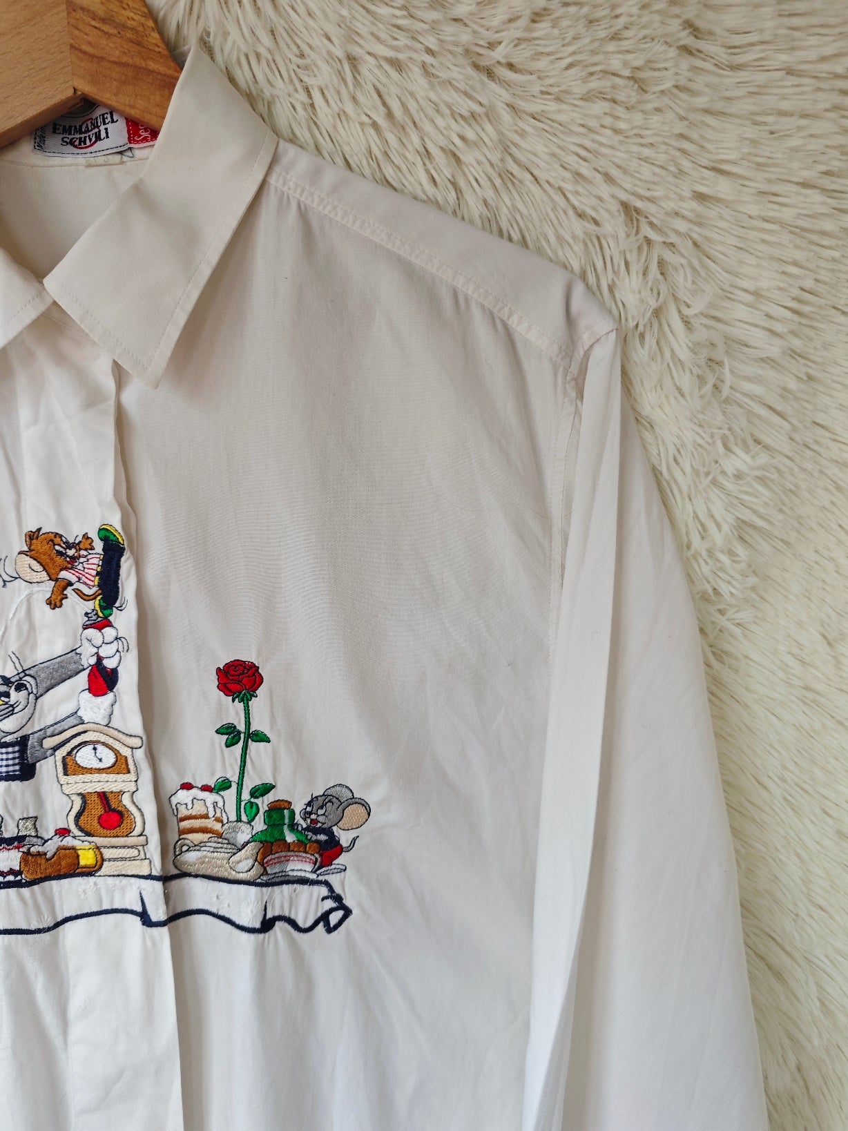 Camicia in puro cotone bianco della collezione Segreta di Emmanuel Schvili con raffinato ricamo frontale ispirato al celebre duo Tom & Jerry. La scena, ricamata con cura e colori vivaci, raffigura Tom che cerca di acchiappare Jerry in un’ambientazione da cucina ricca di dettagli: dolci, frutta e una rosa rossa.