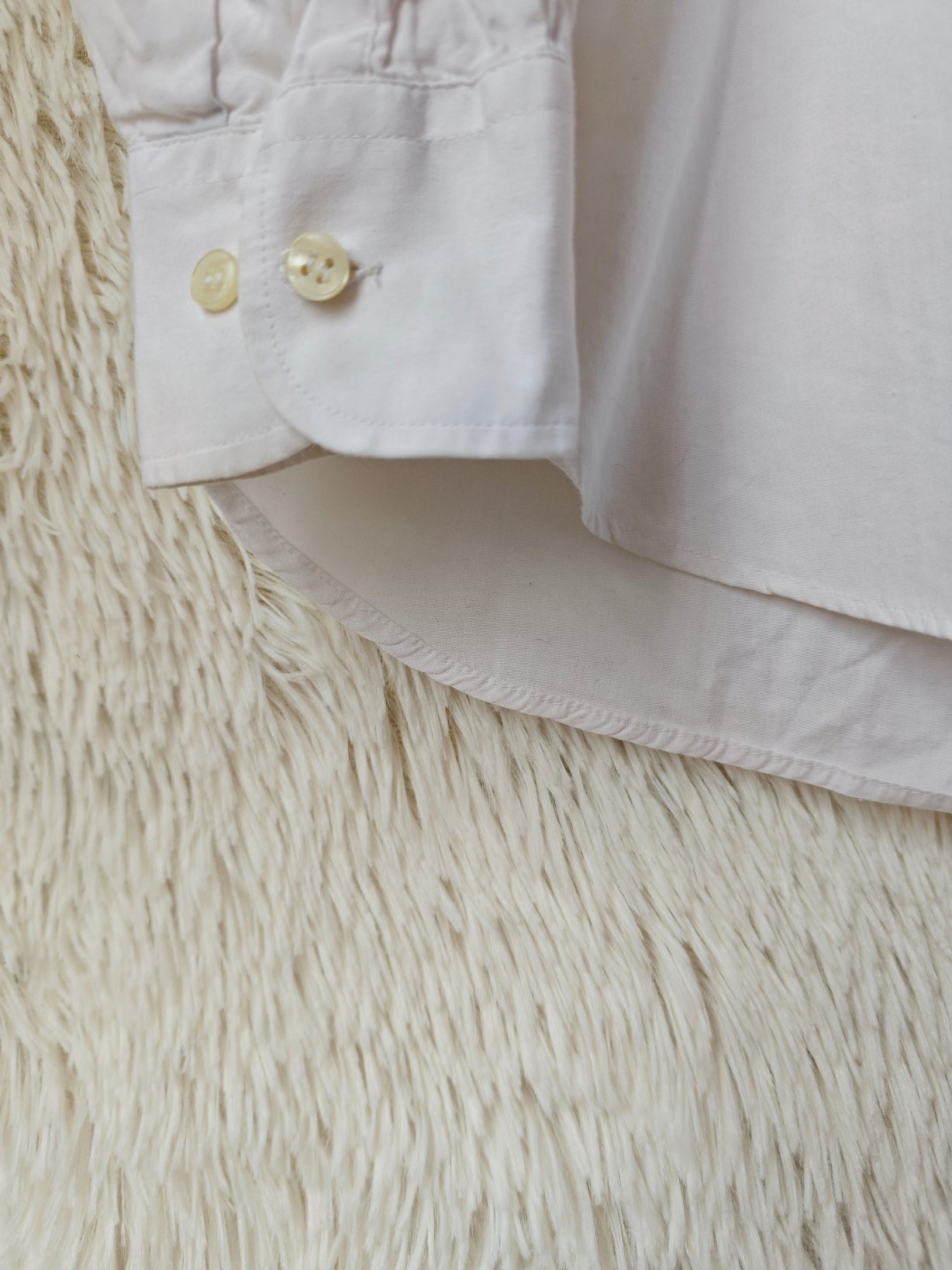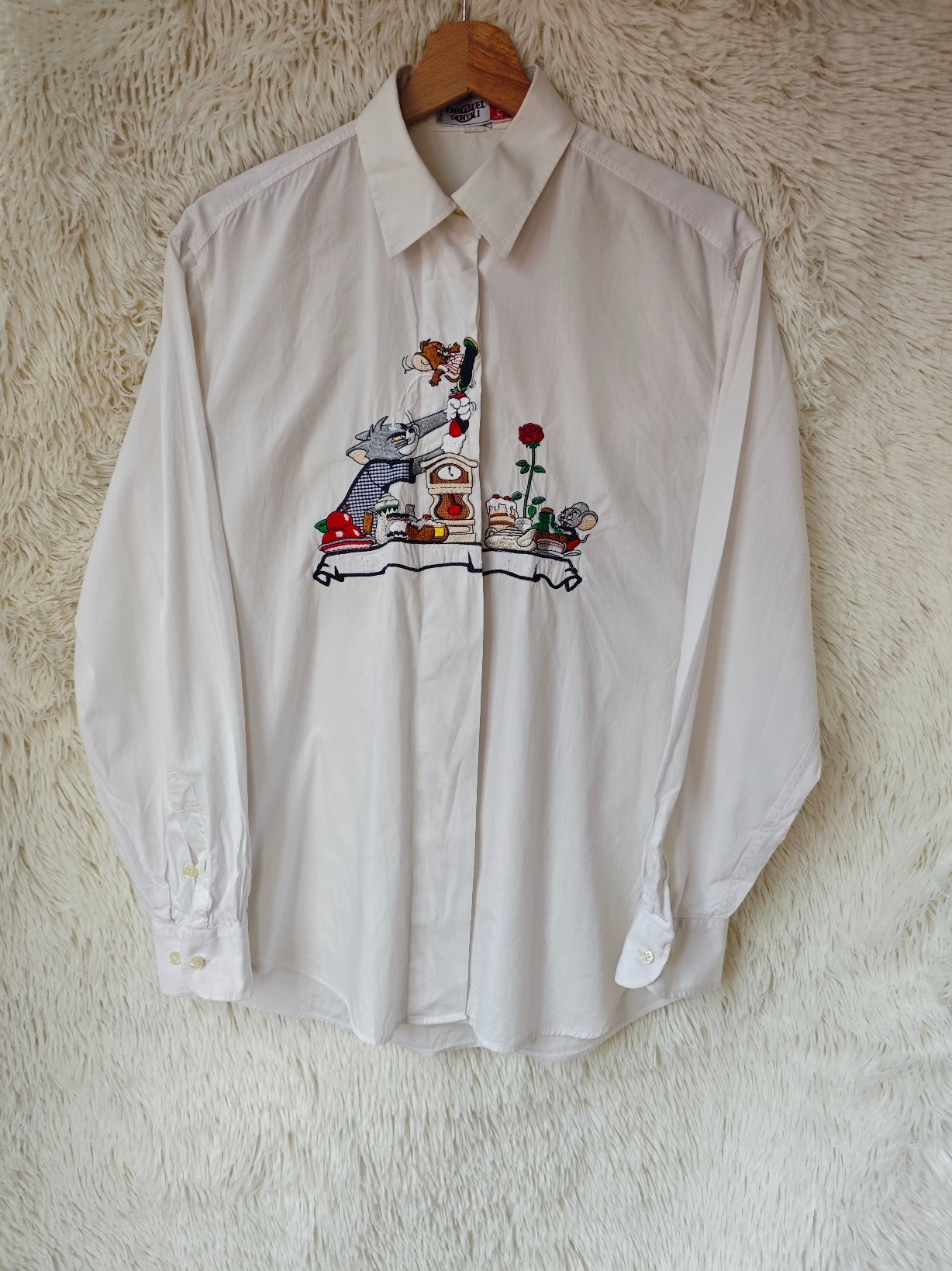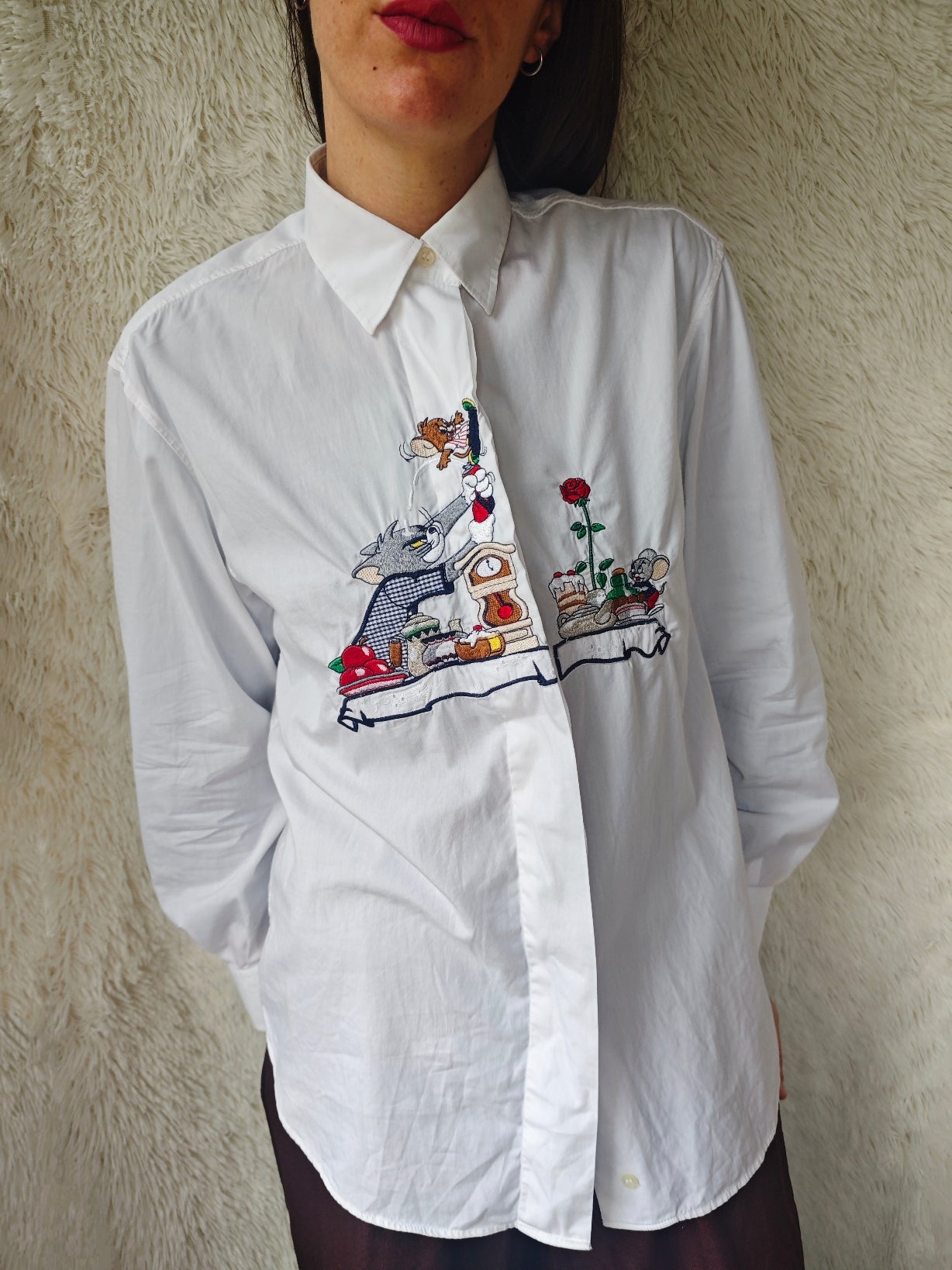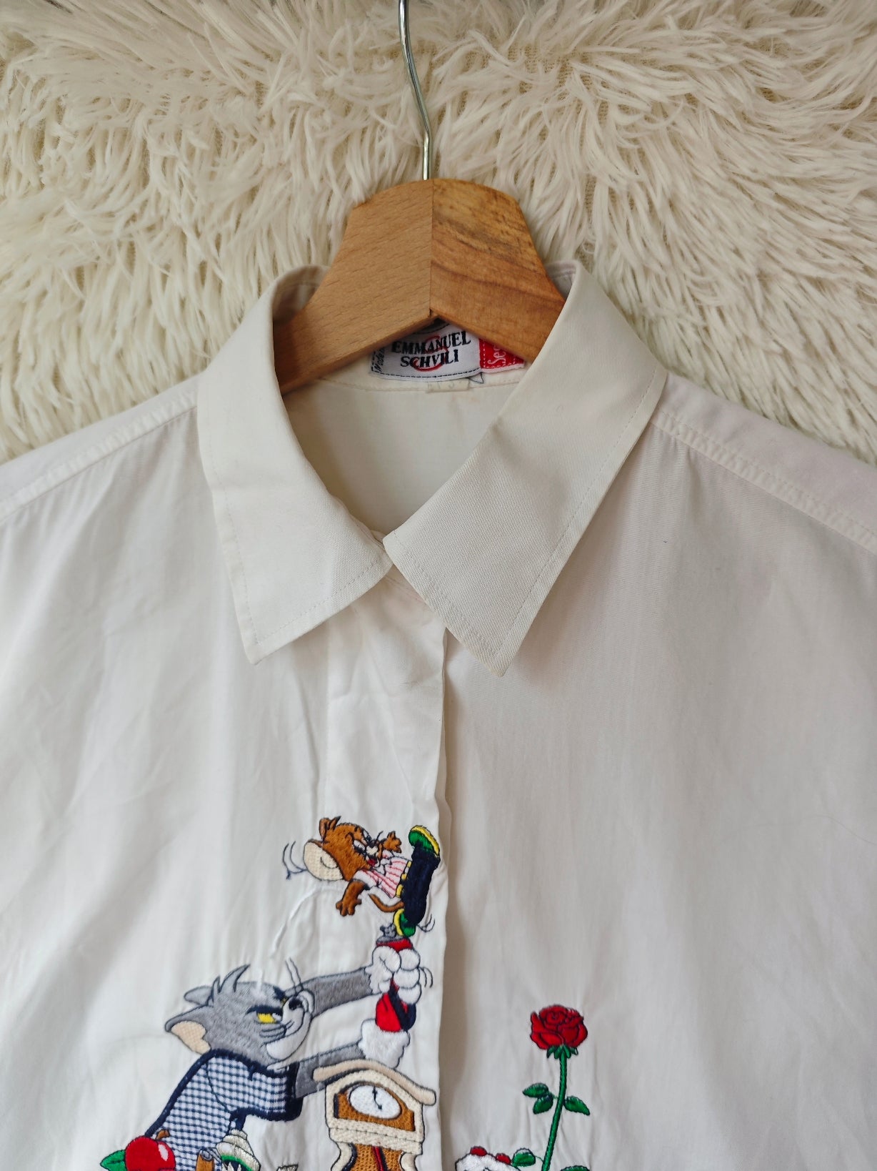 Camicia in puro cotone bianco della collezione Segreta di Emmanuel Schvili con raffinato ricamo frontale ispirato al celebre duo Tom & Jerry. La scena, ricamata con cura e colori vivaci, raffigura Tom che cerca di acchiappare Jerry in un’ambientazione da cucina ricca di dettagli: dolci, frutta e una rosa rossa.